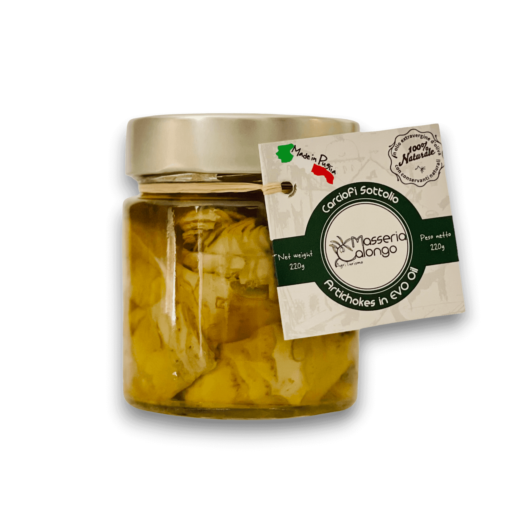 A poche ore dalla raccolta, i carciofi vengono torniti e lavorati esclusivamente a mano: tagliati a spicchi, adagiati nei vasetti e ricoperti unicamente con olio extravergine di oliva, senza l’aggiunta di altri ingredienti superflui.
