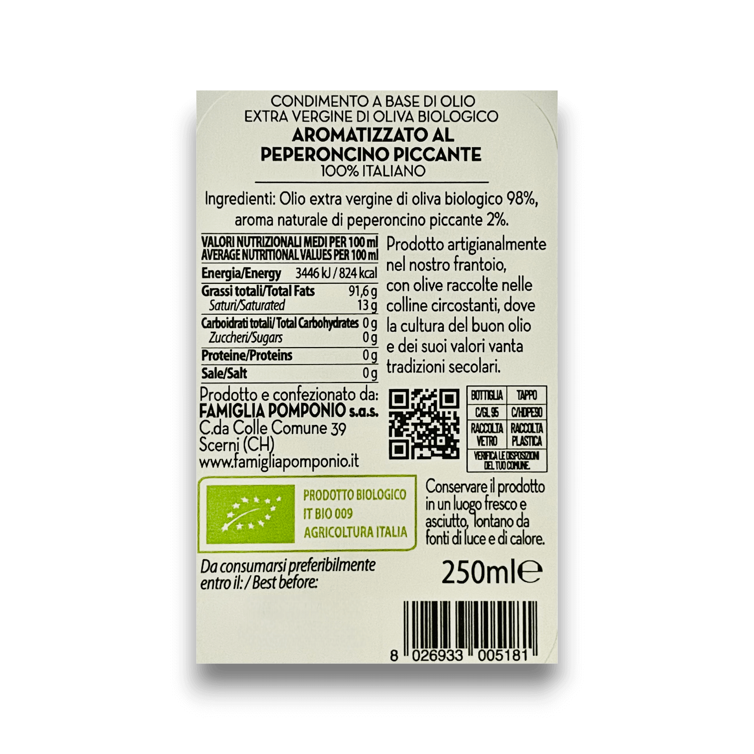 Ingredienti: olio EVO biologico 98%, aroma naturale di peperoncino piccante 2%.